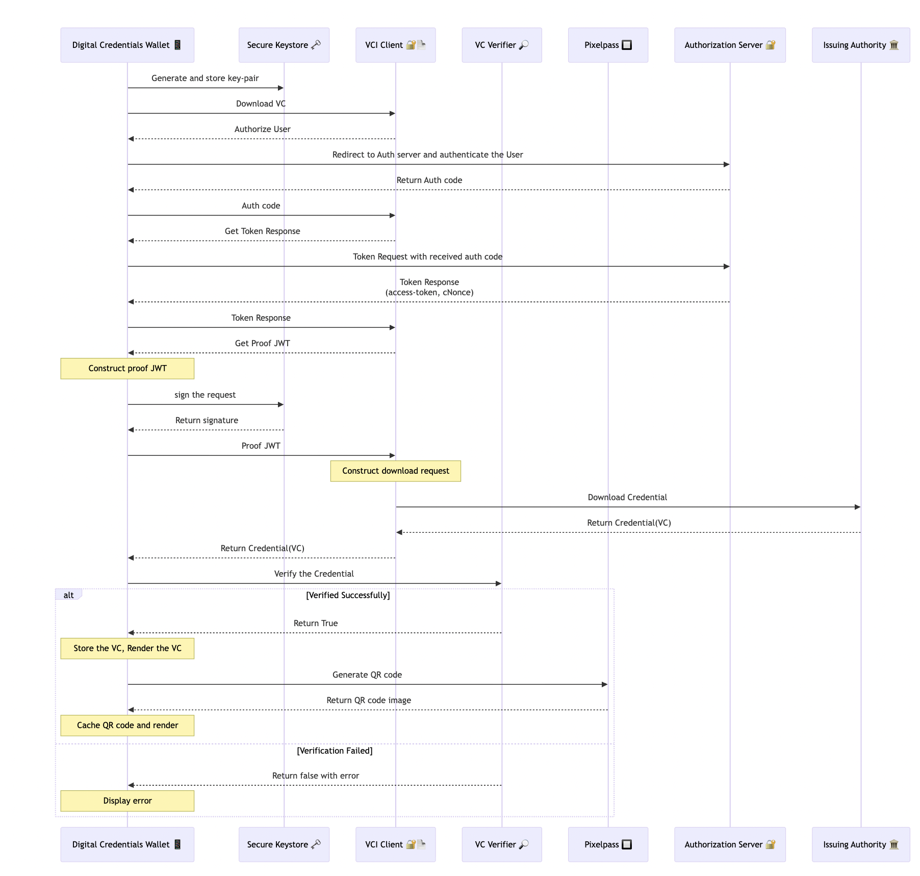 The flow below shows how the custom verifiable credentials wallet downloads and verifies a credential.