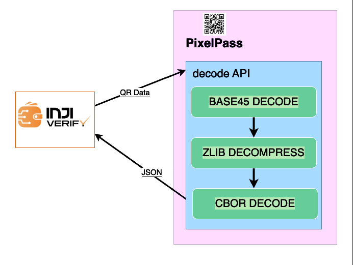 The below diagram shows how Inji Verify utilises PixelPass library.