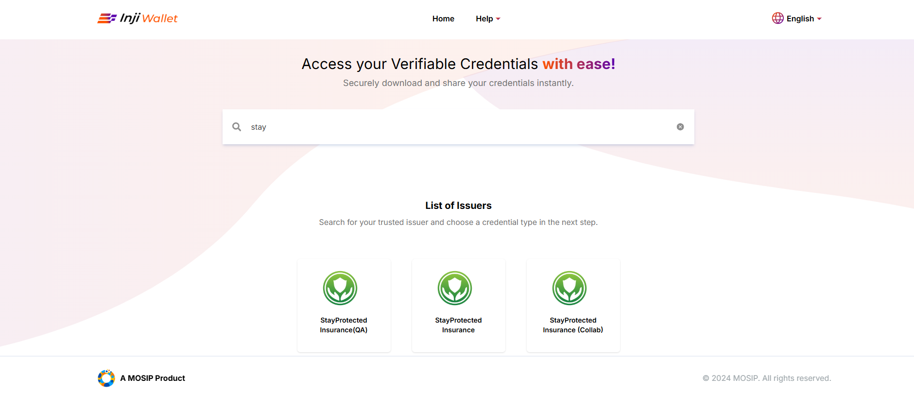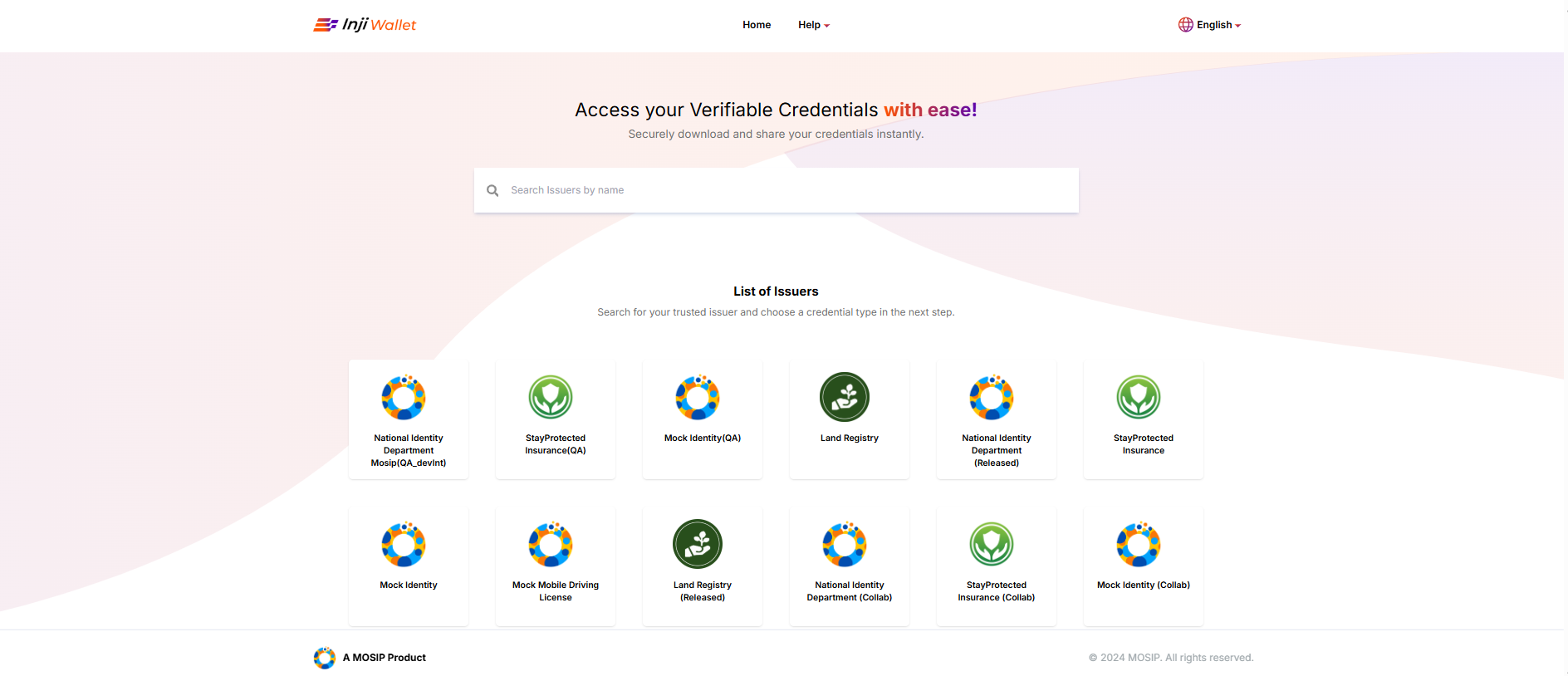 * Launch the Inji Wallet (Web) in your web browser, The home page presents you with the list of Issuers. You can also use the 'Search' box to search for and quickly find the Issuer (Credential Issuer) you are looking for.