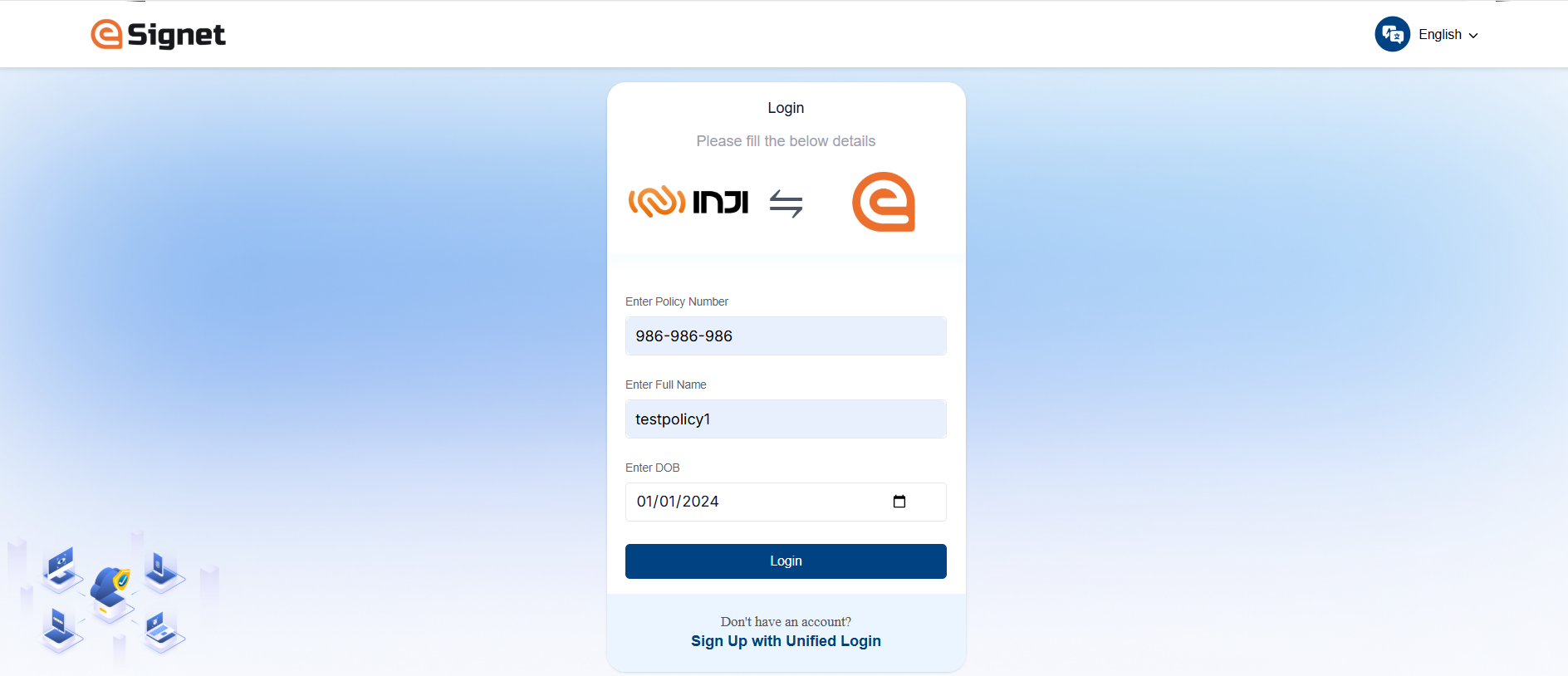* On eSignet authentication page enter **Policy Number**, **Name** and **DOB** (KBI Method) and click on '**Login**'. **Note**: All the fields are mandatory.