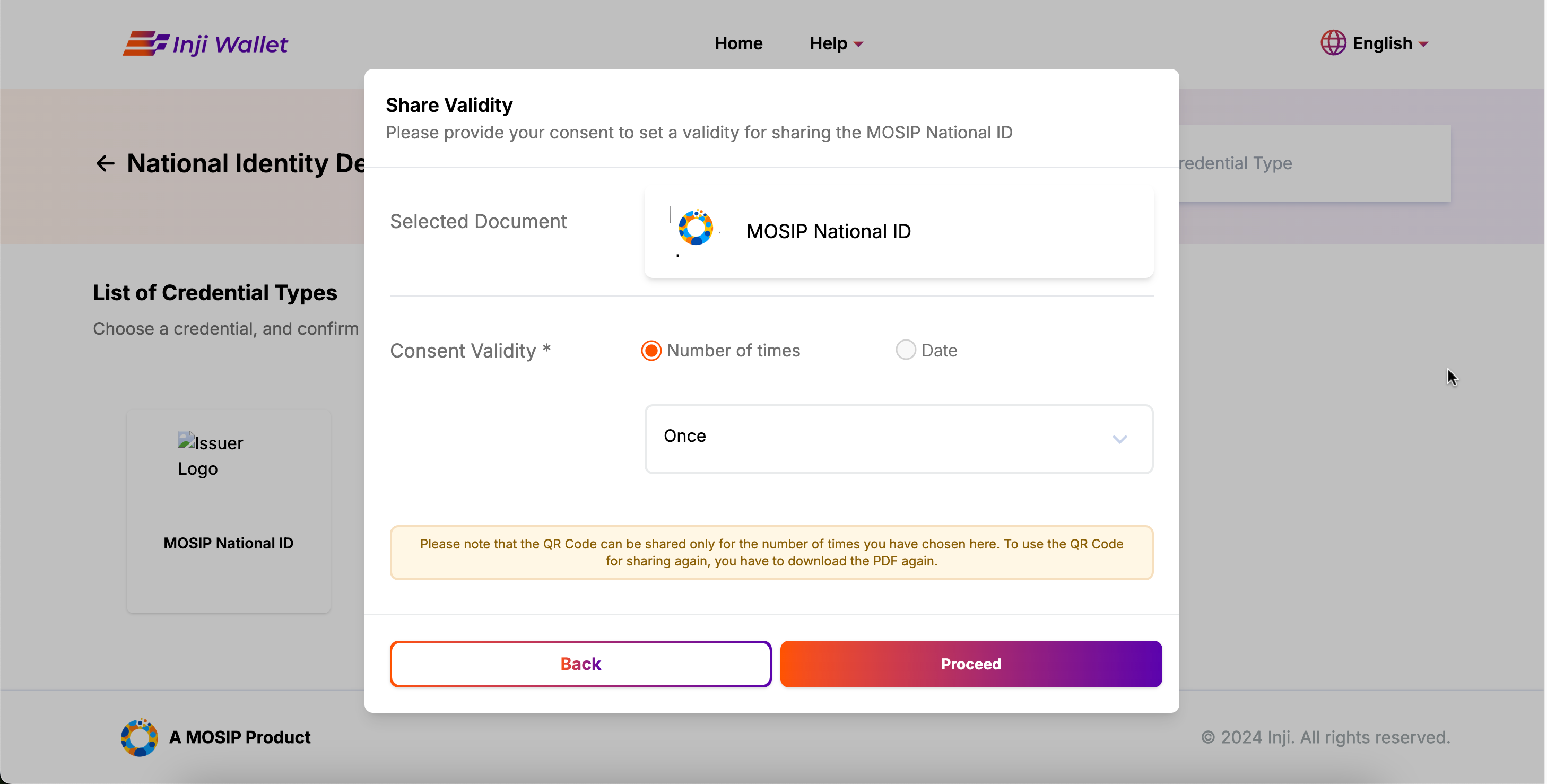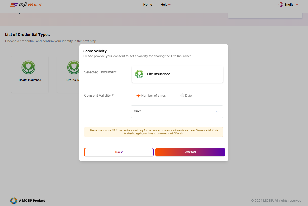 * On '**Share Validity**' screen you can choose to decide the number of times a credential can be used, choose from tyhe dropdown (Once, Twice, Unlimited or Custom). Click Ok and proceed, It takes you to next page for authentication (eSignet).