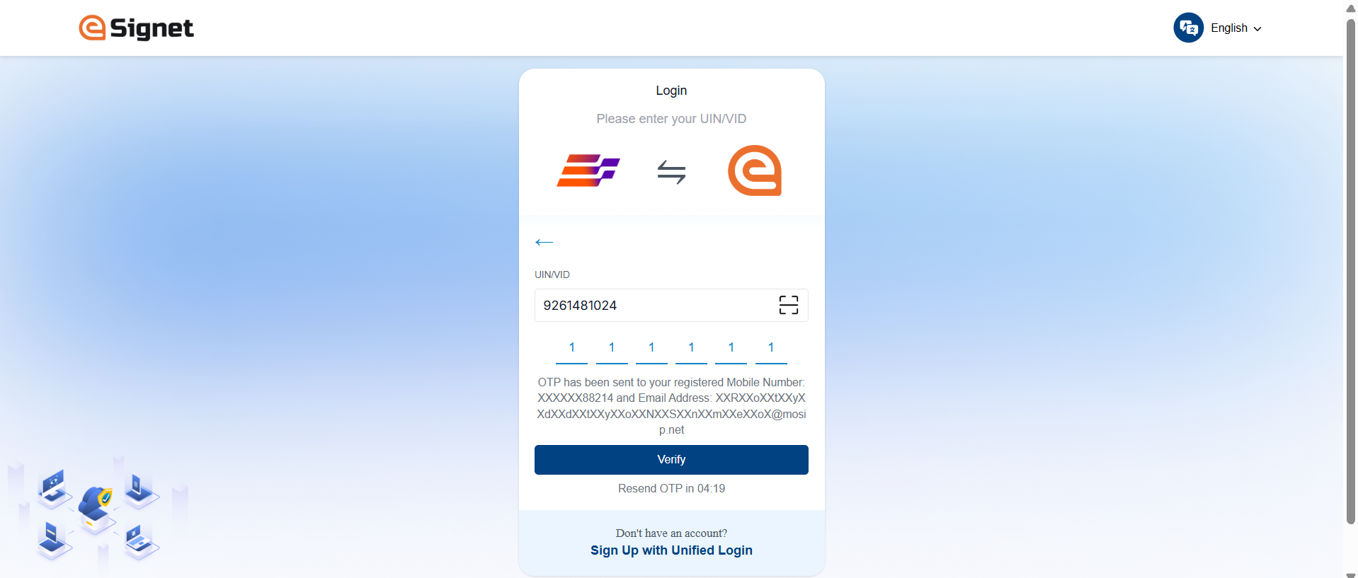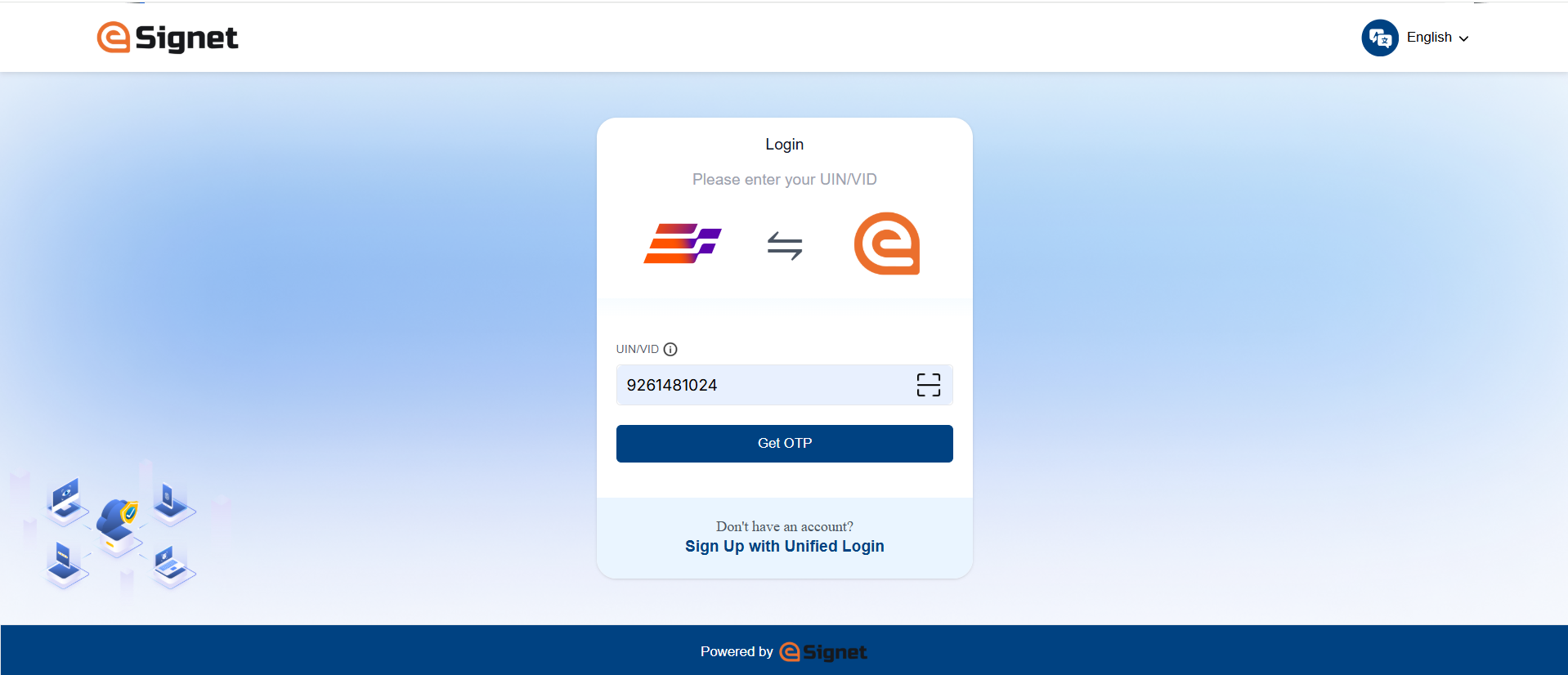 * On eSignet authentication page enter UIN/VID and click on '**Get OTP**', a next screen will appear asking you to enter OTP.