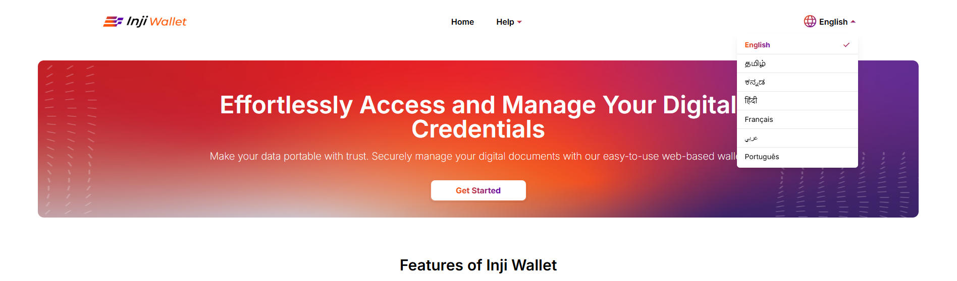 You can choose your preferred language using '**language Selection**' options available on the **Main-Menu**. Inji Web now supports 4 International Language (English, French and Arabic) and 3 Indian Languages (Tamil, Hindi and Kannada).