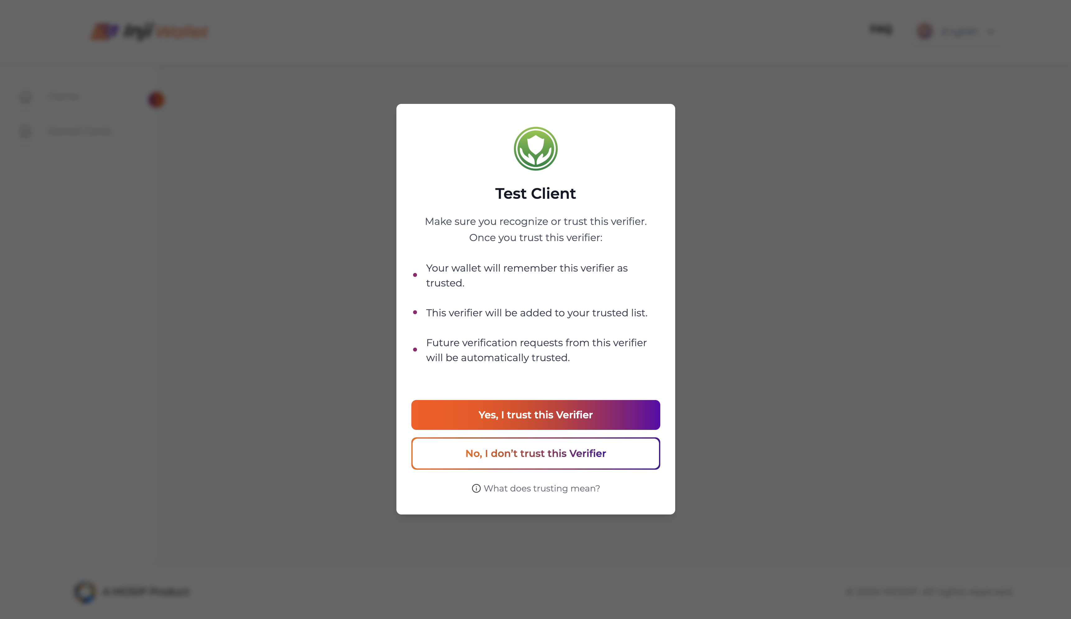 <figure><img src="https://3039626265-files.gitbook.io/~/files/v0/b/gitbook-x-prod.appspot.com/o/spaces%2FaY8BQ4hdzhSchZV814Ev%2Fuploads%2Fgit-blob-ae1b663c13c78de898db1a2a322802083577fb65%2FScreenshot%202025-11-20%20at%206.58.29%E2%80%AFPM%20(1).png?alt=media" alt=""><figcaption><p><strong>Verifier Trust Screen</strong></p></figcaption></figure>