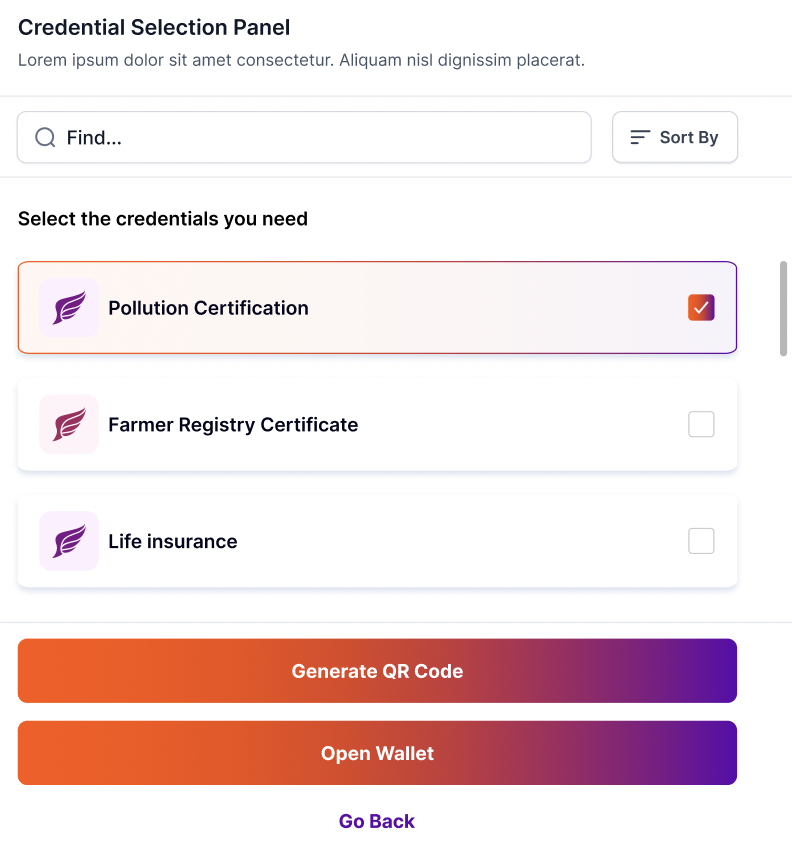 <figure><img src="https://3039626265-files.gitbook.io/~/files/v0/b/gitbook-x-prod.appspot.com/o/spaces%2FaY8BQ4hdzhSchZV814Ev%2Fuploads%2Fgit-blob-c5b86ec2d9034385f5daebb8942e48c2b4108b44%2Fimage.png?alt=media" alt=""><figcaption><p><strong>Credential Selection Panel from Verifier</strong></p></figcaption></figure>