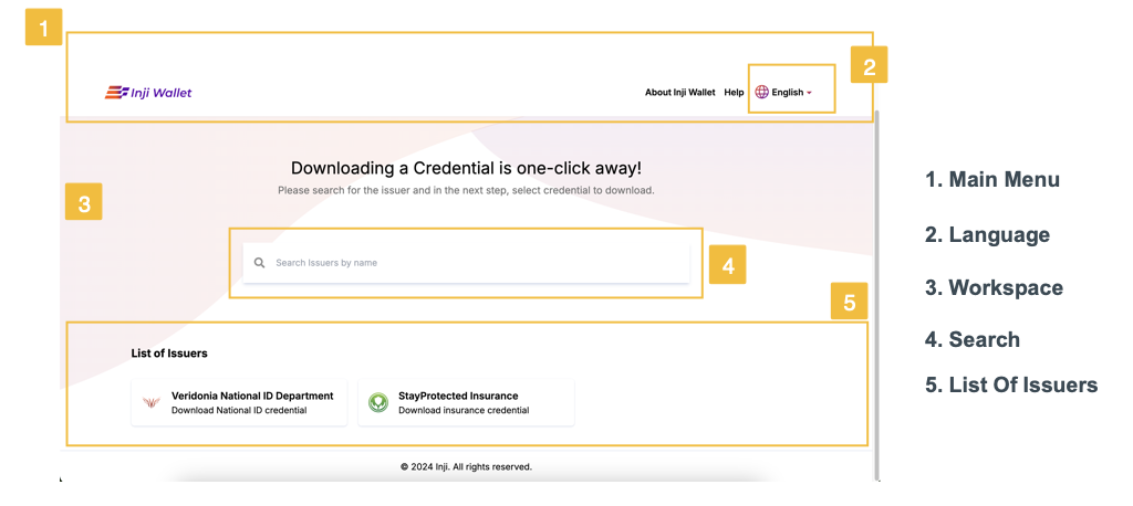 Inji Wallet (Web) offers a browser-based interface similar to Inji Wallet, designed to be fully responsive across desktops, tablets, and mobile browsers. This section provides a high-level overview of the interface (Desktop View), labelling each key component to help you quickly locate items referred to throughout this guide.