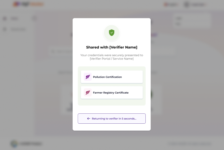 <figure><img src="https://3039626265-files.gitbook.io/~/files/v0/b/gitbook-x-prod.appspot.com/o/spaces%2FaY8BQ4hdzhSchZV814Ev%2Fuploads%2Fgit-blob-f33c2f951588965abb734a07d241b695570d814e%2Fimage.png?alt=media" alt=""><figcaption><p><strong>Confirmation Screen and Redirecting back to Verifier</strong></p></figcaption></figure>